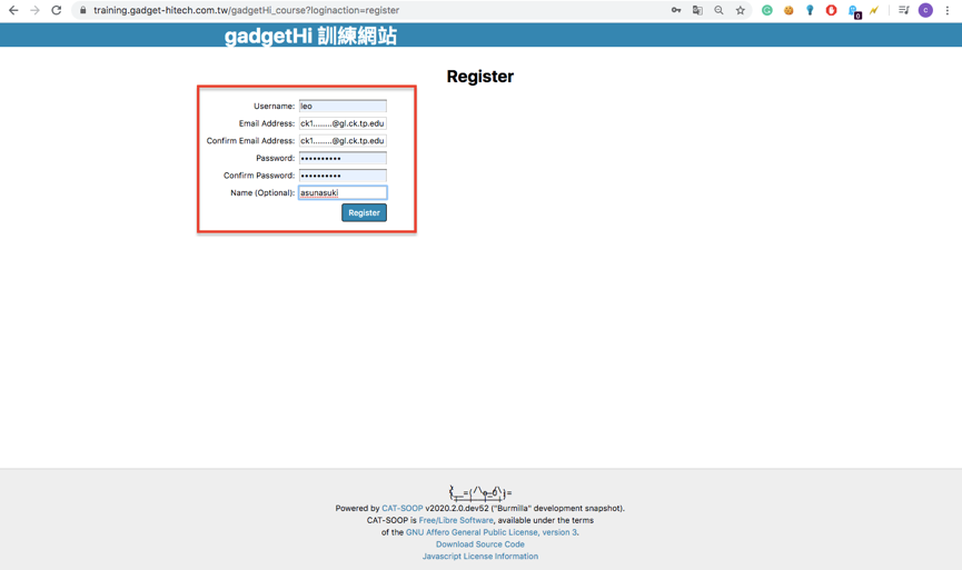 然後輸入所有的資訊包括Username(請使用新手禮包上給的Username),其餘資訊就依序填入,按下Register就表示你成功註冊了。如果遇到問題請先確認Username是否正確,若還是無法解決請聯繫資訊組。